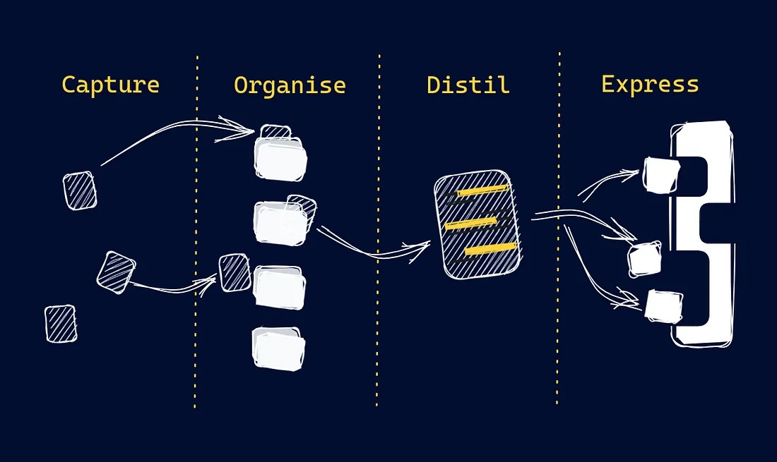 The CODE cycle (Collect → Organize → Distill → Express) turns scattered knowledge into actionable insights by moving information through refinement stages.